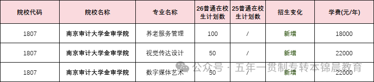 南京审计大学金审学院:开设养老服务管理(计划数100)、视觉传达设计(计划数50)、数字媒体艺术(计划数50)三个专业。